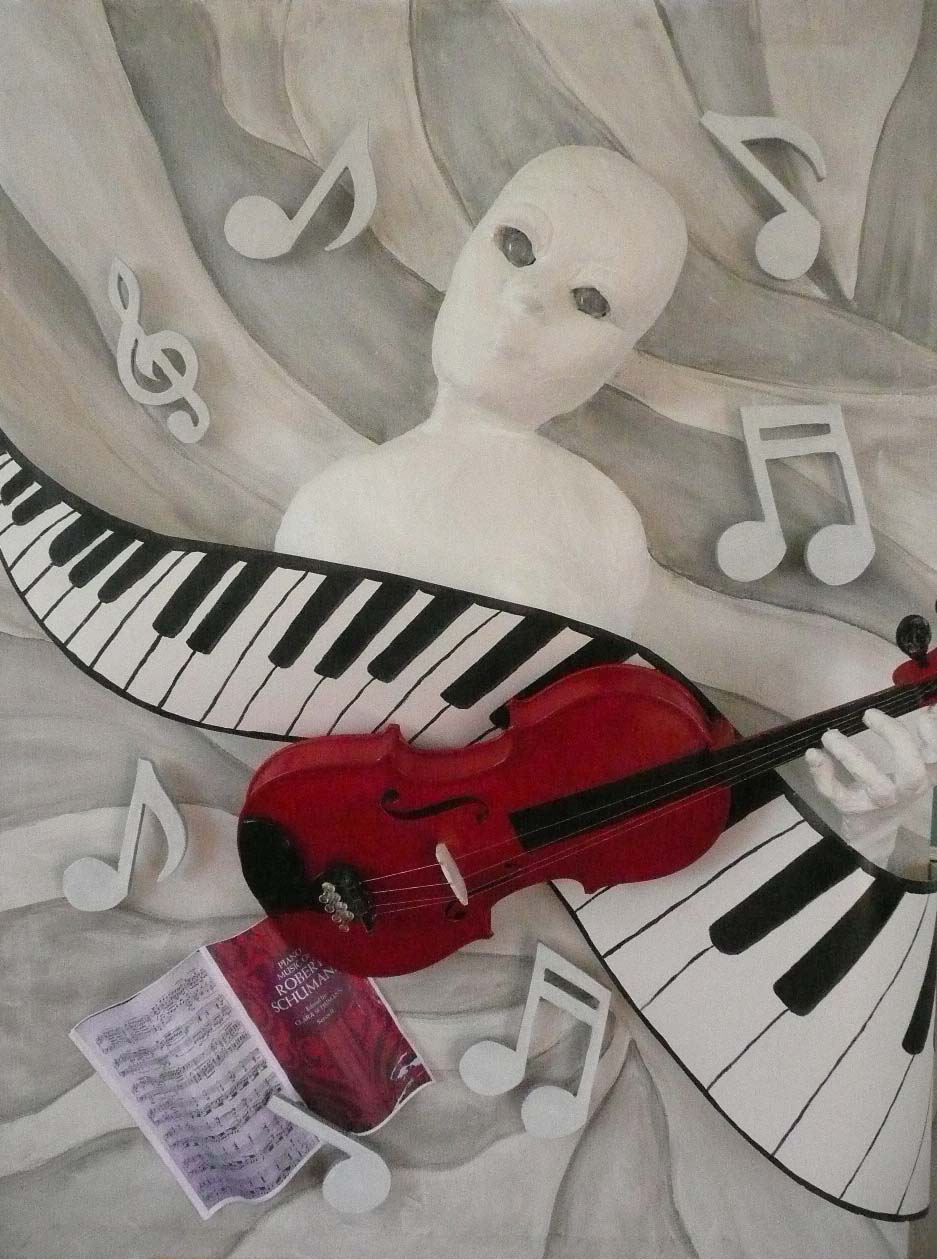 In front of the violin is a booklet I made of a musical score. It has several pages that were copied from an old Schumann book of music, glued together, stitched down the center and then molded to simulate a book in use. It would later be affixed to the canvas with strong glue but looks like it was stitched to the canvas.